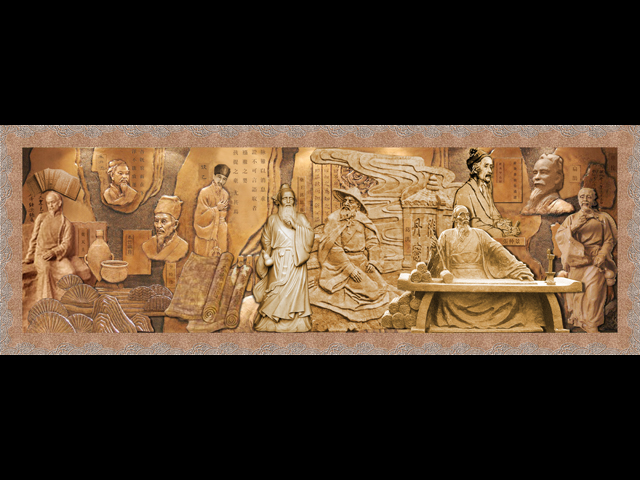 這個(gè)銅浮雕墻是為安徽金馬藥業(yè)設(shè)計(jì)的大門墻壁裝飾浮雕設(shè)計(jì)方案。以我國(guó)歷史上著名的醫(yī)者人物為主要雕刻對(duì)象,配以古文字、圖案、書(shū)卷等古代物品突出了醫(yī)藥的主題并彰顯了公司的歷史文化和傳統(tǒng)。