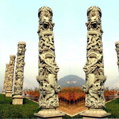 青石浮雕龍石柱景區(qū)戶外廣場擺放文化石柱雕塑.圖片展示