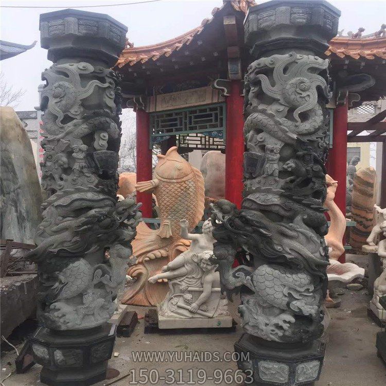 青石石雕戶外盤龍石柱雕塑.詳細說明