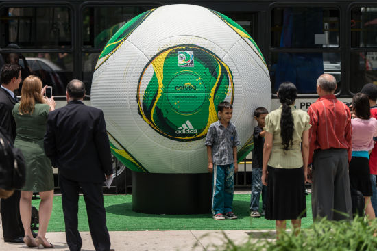 北京時間12月4日,2013年巴西聯(lián)合會杯用球CAFUSA雕塑亮相巴西圣保羅街頭。巴西市民紛紛與之合影留念。圖為兒童與雕像合影。