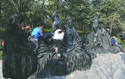 浣花溪公園的詩歌典故園內(nèi),在雕塑“飲中八仙”上,兩名小孩正興奮地爬上爬下,大人則站在一旁吃小吃。詩歌大道上,杜甫、李白和屈原三位詩人的大型集體雕塑平臺(tái)上,盡管立有“為了您的孩子的安全,請(qǐng)勿在雕塑臺(tái)上嬉戲”的告示牌,卻仍有4名小孩在“詩人”身旁爬來爬去,一位女士只在一旁叮囑:“慢點(diǎn),不要碰到頭了?!?